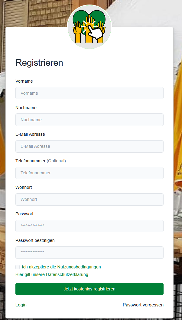 Nach dem Akzeptieren der Nutzungsbedingungen genügt ein Klick auf „Jetzt kostenlos registrieren“ – schon ist das Benutzerkonto angelegt. Alternativ können sich bestehende Nutzer direkt einloggen oder ein neues Passwort anfordern.