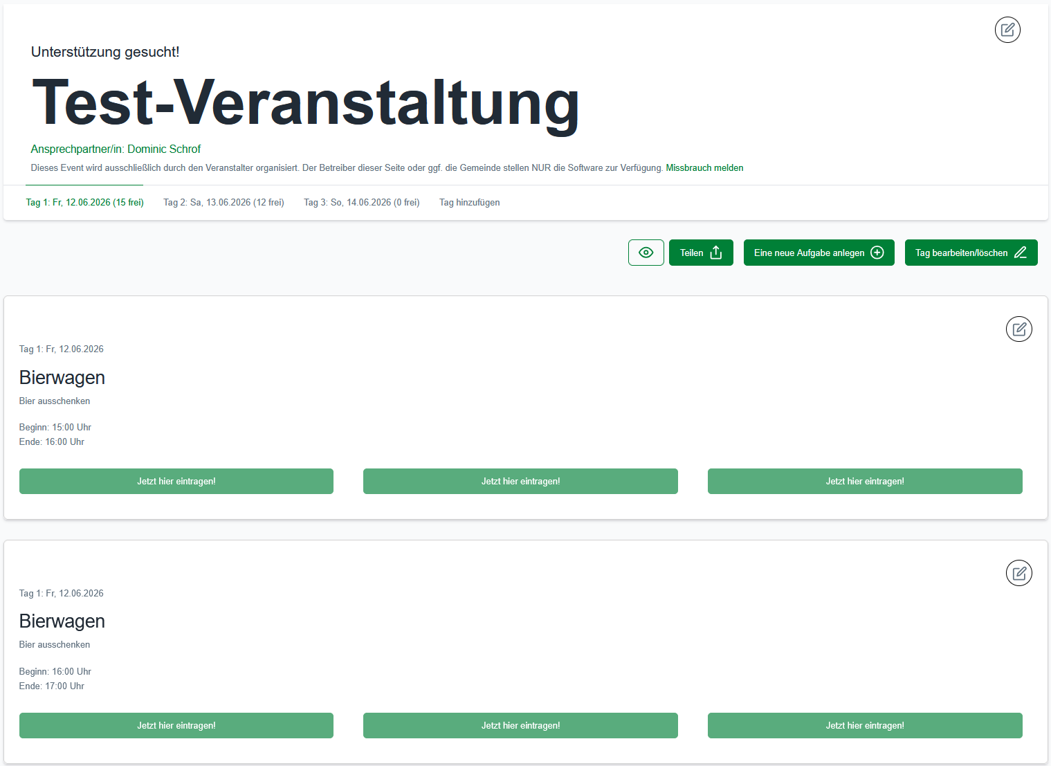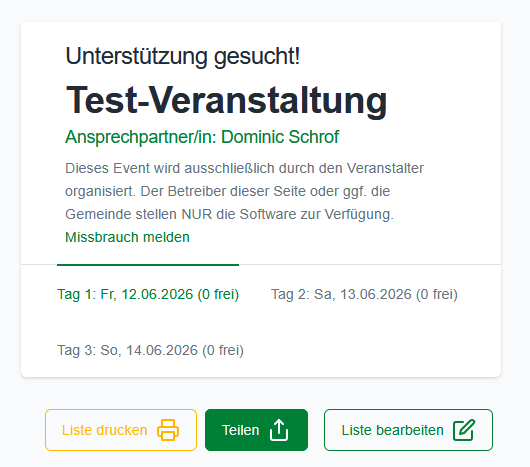Die für eine Aufgabe definierten Schichten/ Zeiträume werden in der Veranstaltungsansicht einzeln angezeigt mit der entsprechenden Anzahl der Helfer-Slots. Hier werden auch bereits eingetragene Helfer angezeigt.