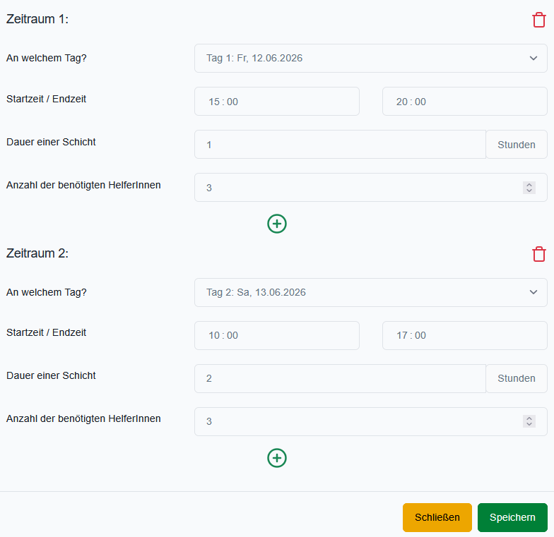 Für jede Aufgabe lassen sich nun konkrete Zeiträume (Schichten) anlegen. Das ist besonders hilfreich bei längeren Veranstaltungen oder mehreren Tagen.