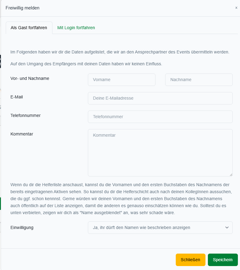 Klicken Helfer:innen auf den öffentlichen Link und anschließend auf „Jetzt hier eintragen!“, öffnet sich das Eintragungsformular.